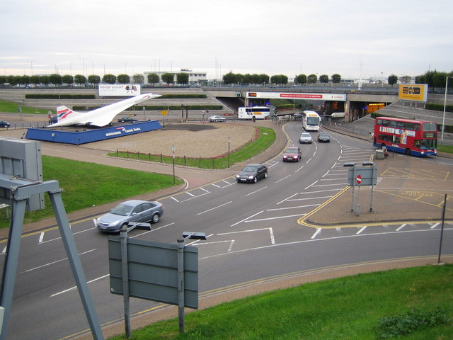 English: Heathrow Airport. This one third scale model of Concorde is at the northern end of the vehicle tunnel to Terminals 1, 2 and 3 at Heathrow, and at the southern end of the M4 Motorway spur. The right hand one of the two white coaches is emerging from the northbound tunnel from the Terminals. The airport itself opened for civilian use in 1946. The photo was taken from the A4 Bath Road overbridge.
