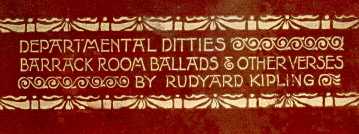 (Low-resolution (40% of original) scanned image of the gilt title on cover of the 1890 first American edition of "Barrack Room Ballads and Other Verses," by Rudyard Kipling, published by United States Book Company, New York (successors to John W. Lovell C) |