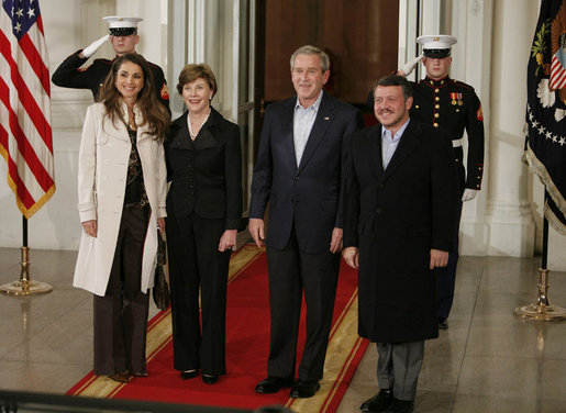 US President George W. Bush and Mrs. Laura Bush welcome Jordan's King Abdullah II and Queen Rania upon their arrival to the White House for a social dinner Tuesday evening, March 6, 2007. |