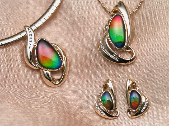 Fine ammolite jewellery ( pendants and a set of earrings) in 14 karat gold with diamond accents. The ammolite gems are triplets. Jewellery and image by Korite International. Submitted with the permission of Kenneth Hare of Korite International.