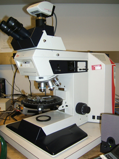 English: en:Leica DMRX incident light microscope with mechanical stage and Swift F automated point counter for analysis of organic composition of coal and rock samples. Image found here.