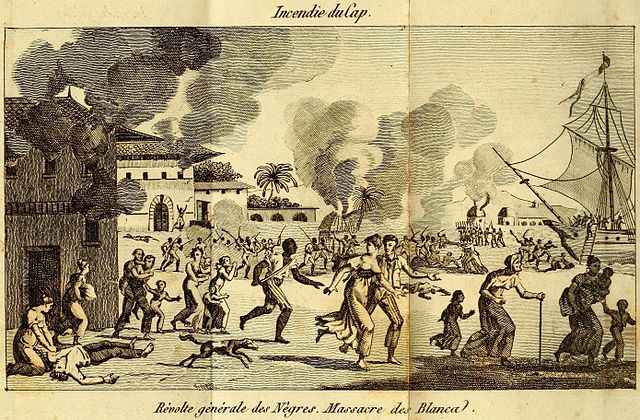 "Incendie du Cap" (Burning of Cape Francais). "Revolte générale des Negres. Massacre des Blancs" (General revolt of the Blacks. Massacre of the Whites].