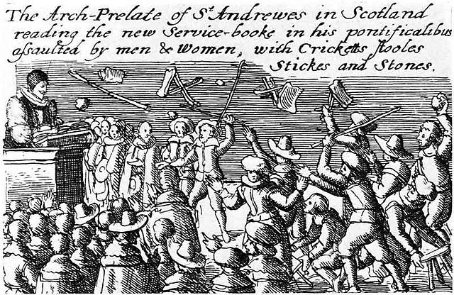 Rioting at a church service in  Scotland after the angry reaction from  Jenny Geddes to use of the  Anglican service in  St Giles Cathedral in  1637.