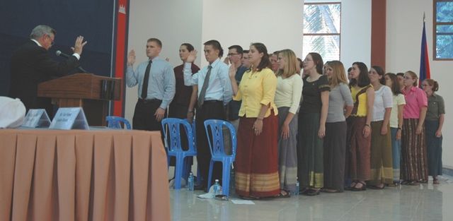 Peace Corps Director Ron Tschetter administers the oath of office to the Volunteers in Cambodia, April 4, 2007.