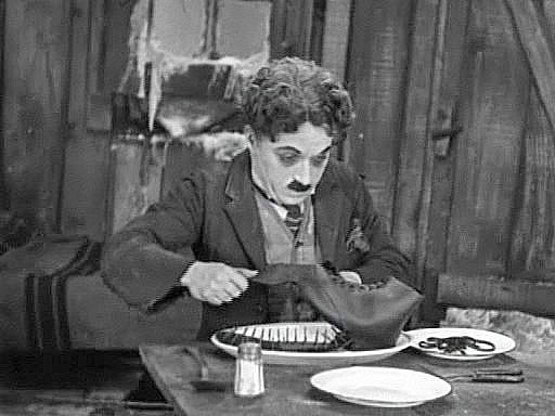English: Charlie Chaplin's character, The Tramp, is carving up a boot, the only thing he has left to eat in The Gold Rush (1925)