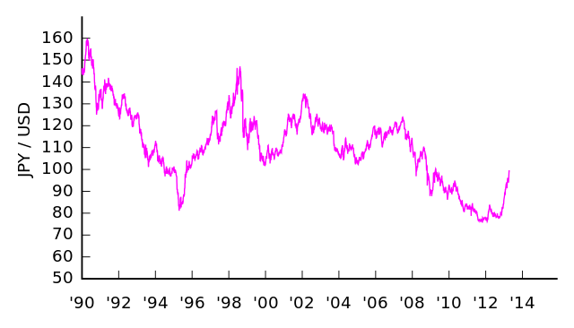 English: Graph showing U.S. dollar and Japanese yen exchange rate from January, 1990.