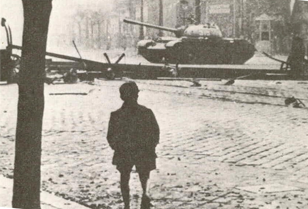 English: A Soviet tank attempts to clear a road barricade in Budapest, Hungary.