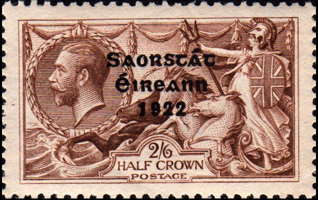 Français :  Timbre de 1922 à l'effigie du roi George V d'Angleterre, surchargé Saorstát Éireann 1922 pour son usage dans la nouvelle République d'Irlande English:  1922 2/6 value  King George V stamp overprinted Saorstát Éireann 1922 for use in the newly independent Irish Free State |