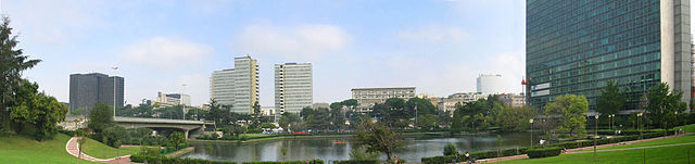 English: EUR, the central business district of Rome. Skyscrapers from the left: Telecom Italia Tower (dark colour), Grattacielo Italia (in the background), Ministero Delle Finanze I, II, III towers (central part of picture), INAIL Tower (white colour, in the background) and Palazzo Eni (dark greenish colour).