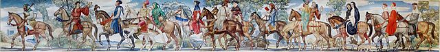 English: Canterbury tales mural by Ezra Winter. North Reading Room, west wall, Library of Congress John Adams Building, Washington, D.C. According to the inscription, this mural shows (left to right): "The Miller, in the lead, piping the band out of Southwark; the Host of Tabard Inn; the Knight, followed by his son, the young Squire, on a white palfrey; a Yeoman; the Doctor of Physic; Chaucer, riding with his back to the observer, as he talks to the Lawyer; the Clerk of Oxenford, reading his beloved classics; the Manciple; the Sailor; the Prioress; the Nun; and three priests." (Source: John Y. Cole, On These Walls. Washington, D.C.: Library of Congress, 1995, p. 79)