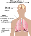English: Main symptoms of different variants and stages of tuberculosis (See Wikipedia:Tuberculosis), with many symptoms overlapping with other variants, while others are more (but not entirely) specific for certain variants. Multiple variants may be present simultaneously.