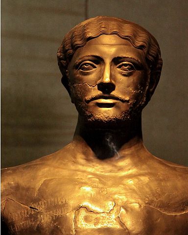 العربية: ذمار علي يهبر، ملك من مملكة حمير اليمنية حكم في أواخر القرن الميلادي الثالث أو بدايات الرابع بعد الميلاد. التمثال يظهر التأثير اليوناني على بعض فنون اليمن القديم. معروض في متحف صنعاء الوطني