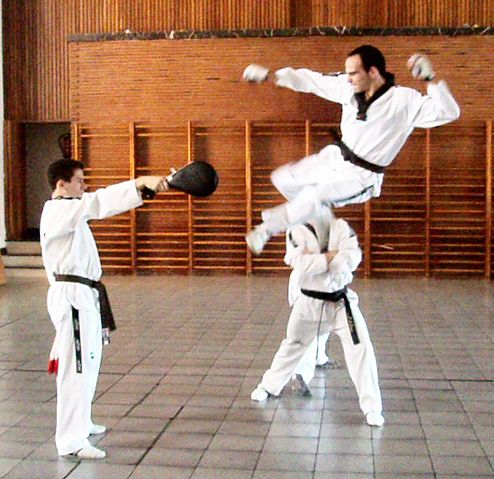 Español: Dollyo chagui en salto con apoyo (en este caso en el pecho de un compañero, ante la imposibilidad de utilizar una pared para el apoyo). Foto tomada en la preparación previa para una exhibición de Taekwondo realizada por el club Han Mu Do (www.hapkido-aeh.com) en el colegio San Viator.