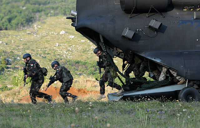 Special operations soldiers from Hungary depart from an U.S. Army MH-47 Chinook helicopter, assigned to the 160th Special Operations Aviation Regiment, in Kovachevo, Croatia during fast rope insertion/extraction system training as part of the Jackal Stone 2009 exercise held in Croatia.