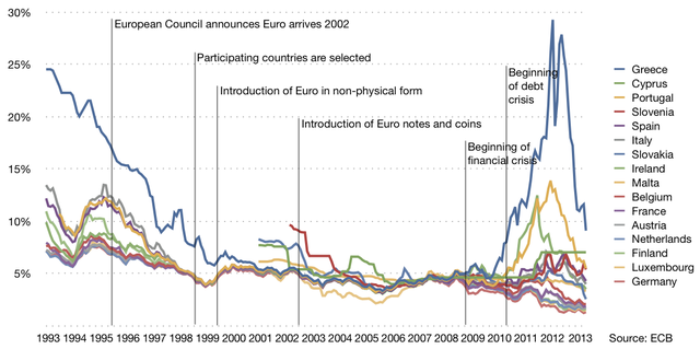 English: Long-term interest rate statistics for all Eurozone countries. (percentages per annum; period averages; secondary market yields of government bonds with maturities of close to ten years) Source: http://sdw.ecb.europa.eu