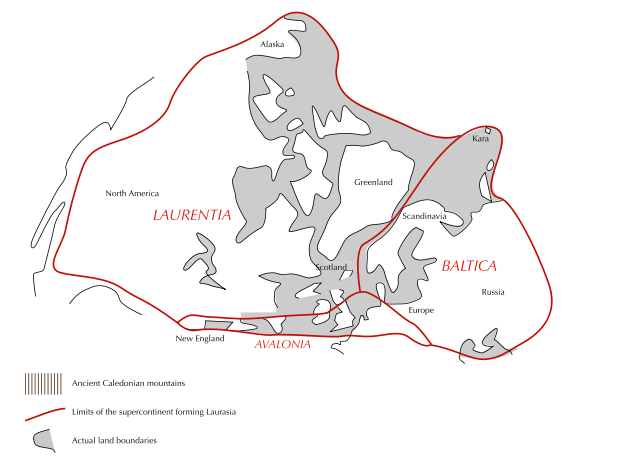 English: Translated  File:Laurussia_fr.svg from French, author Thomas Robert, edited by Max Naylor using Adobe Illustrator CS2. Map of the Eurasian supercontinent (Devonian).