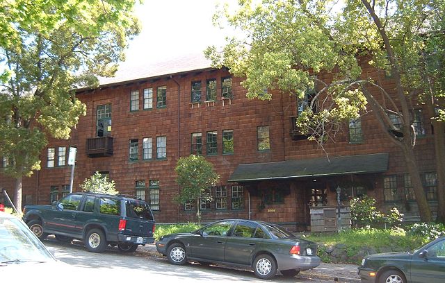 English: Cloyne Court Hotel as it exists today, in Berkeley. This picture shows a view of the building from Ridge Road on the north side of the house, including the front door.