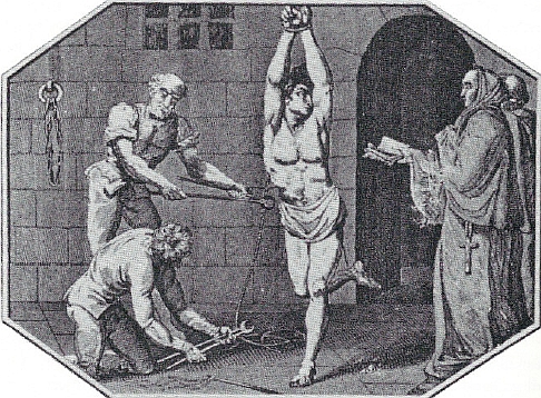 Source: http://www.humnet.ucla.edu/santiago/whipping.gif Caption reads: "Two old priests showing the application of torture under the supervision of the Inquisition"