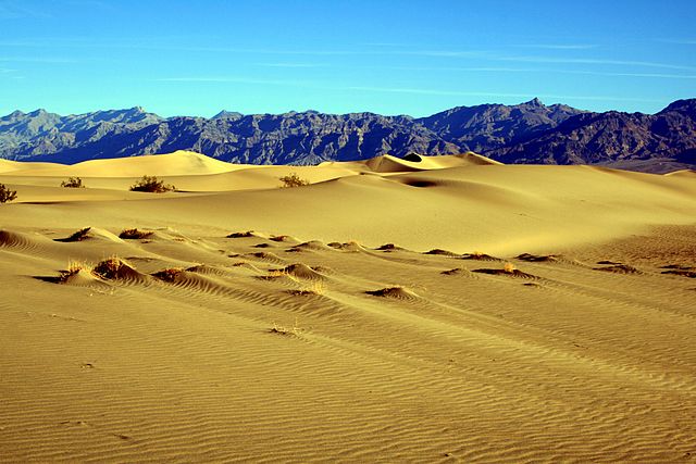 Sand Dunes in Death Valley National Park. The image shows coppice dunes , which are formed around vegetation. These dunes are usually found in the deserts in semiarid regions. Like with all sand dunes the coppice dunes form, when there is lots of loose sand,a wind, which is strong enough to move the sand and some kind of obstruction, where sand particles settle out. The size and shape of a coppice dune depends on the amount of sand available, the characteristics of the wind and on forms of vegetations they form around. As you could see from the image the dunes are very much symmetrical. The image also shows wind ripples. They form, when sand grains bouncing and rolling up the windward surface of a dune land on the windward side of each ripple and produces a low ridge. |