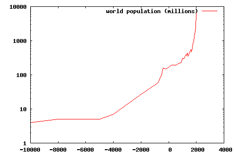 English: log-y scale of the world population curve. Just the same data that appears in World population and in the image:Population curve.svg