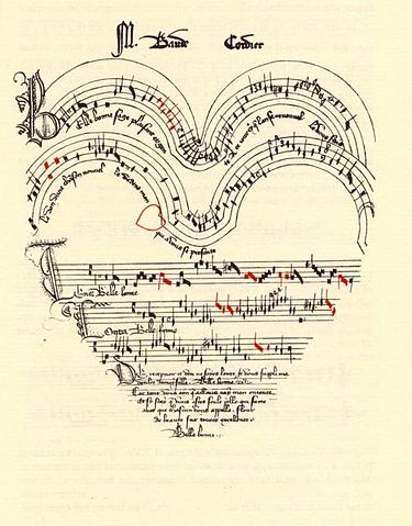 Score of Baude Cordier's chanson "Belle, bonne, sage," from The Chantilly Manuscript, Musée Condé 564. The manuscript is one of the classic examples of ars subtilior, which requires red notes, or "coloration" to indicate changes in note lengths from their normally written values. This chanson, a dedicatory piece on the love of a lady and a lord written in the shape of a heart, opens the corpus. Note the heart of notes within the larger heart. |