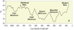 Changes in carbon-14 concentration in the Earth's atmosphere, which serves as a long term proxy of solar activity.
