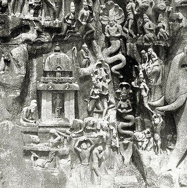 en Relief of the "Descend of the Ganga" in Mahabalipuram (also Mamallapuram), India; the complete relief measures 9 x 27 m.