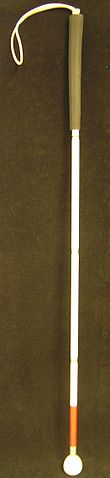 An unfolded long cane. The long cane is the primary mobility tool for blind and vision impaired people. Long canes are often foldable to save space. |