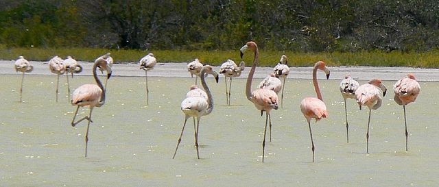 Caribbean Flamingos (Poenicopterus ruber ruber) along shore of Lago de Oviedo, Dominican Republic. |