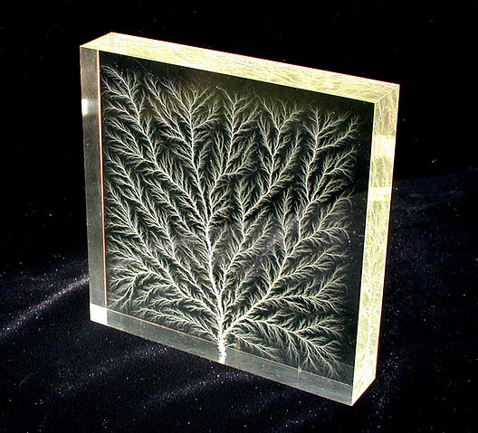 English: Lichtenberg Figure High voltage dielectric breakdown within a block of plexiglas creates a beautiful fractal pattern called a Lichtenberg_figure. The branching discharges ultimately become hairlike, but are thought to extend down to the molecular level. ,  http://www.teslamania.com