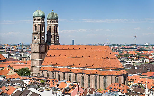 English: Frauenkirche (Church of Our Blessed Lady) in Munich, Germany, as viewed from the tower of Peter's Church. Taken by myself with a Canon 5D and 24-105mm f/4L IS lens.