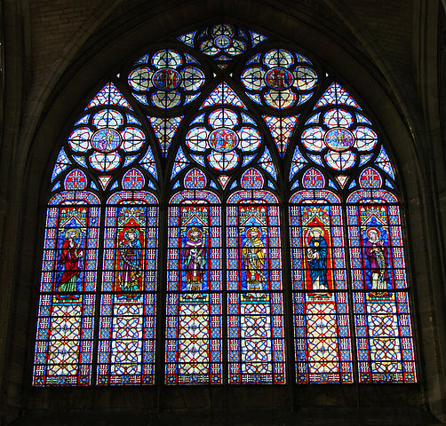 Vitrail de la basilique Saint-Urbain, à Troyes: la verrière de la façade (1900-1903). De gauche à droite: Saint Valérien, Saint Louis, Saint Urbain 1er, Urbain IV (qui a fait construire cette basilique entre 1262 et 1286 car il était originaire de Troyes), Saint Thomas d'Aquin, Sainte Cécile. |