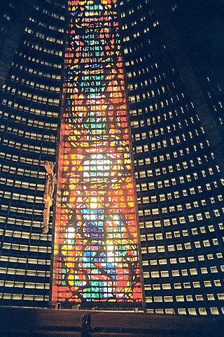 English: Soaring -high rectilinear  stained glass window at Catedral do São Sebastião ( Rio de Janeiro Cathedral or Catedral Metropolitana),  Rio de Janeiro,  Brazil