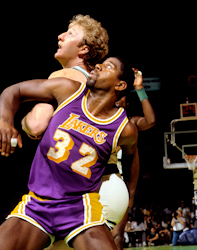 English: Los Angeles Lakers Magic Johnson and Boston Celtics Larry Bird in Game two of the 1985 NBA Finals at Boston Garden
