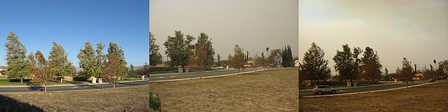 Comparison of the skyline from October 21 (left) and October 22. Taken in Simi Valley, California, during the California wildfires of October 2007. All pictures taken with Canon PowerShot A560. Left—Blue sky with everyday haze. Take note of the Santa Ana winds blowing the trees. Middle—Smoke has reached the vicinity. Winds have calmed briefly. Right—Less smoke than yesterday, but still badly congested. Note the winds. |