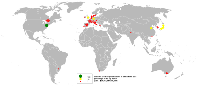 English: This bubble map shows the global distribution of credit available to private sector in 2005 as a percentage of the top market (USA - $24,263,947,100,000). This map is consistent with incomplete set of data too as long as the top market is known. It resolves the accessibility issues faced by colour-coded maps that may not be properly rendered in old computer screens.