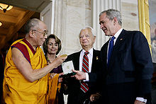 The Dalai Lama receiving a Congressional Gold Medal in 2007. From left: Speaker Nancy Pelosi, Senate President pro tempore Robert Byrd and U.S. President George W. Bush