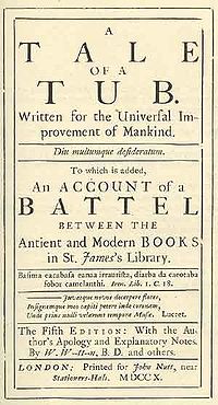 A Tale of a Tub was the first major work written by Jonathan Swift, composed between 1694 and 1697 and published in 1704. It is probably his most difficult satire, and possibly his most masterly. The Tale is a prose parody which is divided into sections of " digression" and a "tale" of three brothers, each representing one of the main branches of Christianity.