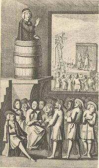 A Tale of a Tub is divided between various forms of digression and sections of a "tale." The "tale," or narrative, is an allegory that concerns the adventures of three brothers, Peter, Martin, and Jack, as they attempt to make their way in the world. Each of the brothers represents one of the primary branches of Christianity in the West. This part of the book is a pun on "tub," which Alexander Pope says was a common term for a Dissenter's pulpit, and a reference to Swift's own position as a clergyman. Peter (named for Saint Peter) stands in for the Roman Catholic Church. Jack (named for John Calvin, but whom Swift also connects to "Jack of Leyden") represents the various Dissenting Protestant churches such as Baptists, Presbyterians, Quakers, Congregationalists, or Anabaptists. The third brother, middle born and middle standing, is Martin (named for Martin Luther), whom Swift uses to represent the 'via media' of the Church of England. The brothers have inherited three wonderfully satisfactory coats (representing religious practice) by their father (representing God), and they have his will (representing the Bible) to guide them. Although the will says that the brothers are forbidden from making any changes to their coats, they do nearly nothing but alter their coats from the start. In as much as the will represents the Bible and the coat represents the practice of Christianity, the allegory of the narrative is supposed to be an apology for the British church's refusal to alter its practice in accordance with Puritan demands and its continued resistance to alliance with the Roman church.