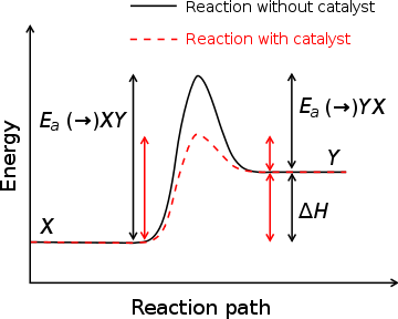 ) and enthalpy of formation (ΔH) with and without a catalyst, plotted against the reaction coordinate. The highest energy position (peak position) represents the transition state. With the catalyst, the energy required to enter transition state decreases, thereby decreasing the energy required to initiate the reaction.A substance that modifies the transition state to lower the activation energy is termed a catalyst; a biological catalyst is termed an enzyme. It is important to note that a catalyst increases the rate of reaction without being consumed by it. In addition, while the catalyst lowers the activation energy, it does not change the energies of the original reactants or products. Rather, the reactant energy and the product energy remain the same and only the activation energy is altered (lowered).