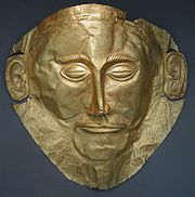 The so-called ' Mask of Agamemnon'. Discovered by Heinrich Schliemann in 1876 at Mycenae. Whether it represents an individual, and who, remains unknown.