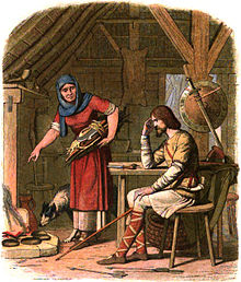 A popular legend, originating from 12th century chronicles, tells how when he first fled to the Somerset Levels, Alfred was given shelter by a peasant woman who, unaware of his identity, left him to watch some cakes she had left cooking on the fire. Preoccupied with the problems of his kingdom, Alfred accidentally let the cakes burn.