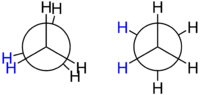 Ethane forms the simplest case for studying the conformation of alkanes, as there is only one C – C bond. If one looks down the axis of the C – C bond, one will see the so-called Newman projection. The hydrogen atoms on both the front and rear carbon atoms have an angle of 120° between them, resulting from the projection of the base of the tetrahedron onto a flat plane. However, the torsion angle between a given hydrogen atom attached to the front carbon and a given hydrogen atom attached to the rear carbon can vary freely between 0° and 360°. This is a consequence of the free rotation about a carbon – carbon single bond. Despite this apparent freedom, only two limiting conformations are important: eclipsed conformation and staggered conformation.
