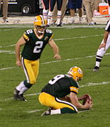 Specific positions for the field goal/PAT unit are the placekicker (K or PK), holder (H) and long snapper (LS). The long snapper's job is to snap the ball back to the holder, who will catch the ball and place it down to the ground (ideally with the laces facing away from the kicker) so that the placekicker can kick the ball. On kickoffs, the kicker placekicks the ball off of a tee; the player on the receiving team who catches the ball is the kickoff returner (KR).