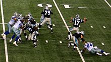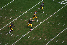 American football, known as football in the United States, is a team sport played between two teams of 11 players with an oval ball on a rectangular field 120 yards long and 53.3 yards wide with goalposts at either end. The team in possession of the ball (the offense) attempts to advance down the field by running with or passing the ball. In order to continue their drive, the offense must advance the ball at least 10 yards down the field in a series of four downs. If they succeed, they receive a new set of four downs to continue their drive, but if they fail, they lose control of the ball to the opposing team. The offense can score points by advancing the ball into the end zone (a touchdown) or by place- or drop-kicking the ball through the opponent's goalpost (a field goal), while the defense can score points by forcing an offensive turnover and advancing the ball into the offense's end zone or by tackling the ballcarrier in the offense's end zone (a safety). The team that has scored the most points by the end of the game wins.