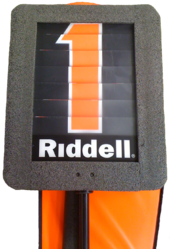 Goalposts are placed at the centre of the plane of each of the two end lines; the crossbar of these posts (measuring 18 feet, 6 inches or 5.64 meters in professional and college play and 23 feet, 4 inches or 7.1 meters in high school play) is placed 10 feet above the ground, while the uprights on both ends of the crossbar are extended 30 feet (9.1 meters) in professional fields, a minimum of 30 feet in college fields, and a minimum of 10 feet (3.1 meters) in high school fields.Padding is placed around the base of the goal post, and oranged-colored ribbons are normally placed at the tip of both uprights.