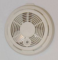 Americium is the only synthetic element to have found its way into the household, where one common type of smoke detector uses 241Am in the form of americium dioxide as its source of ionizing radiation. This isotope is preferred against 226Ra because it emits 5 times more alpha particles and relatively little of harmful γ-radiation. The amount of americium in a typical new smoke detector is 1 microcurie (37 kBq) or 0.28 microgram. This amount declines slowly as the americium decays into neptunium-237, a different transuranic element with a much longer half-life (about 2.14 million years). With its half-life of 432.2 years, the americium in a smoke detector includes about 3% neptunium after 19 years, and about 5% after 32 years. The radiation passes through an ionization chamber, an air-filled space between two electrodes, and permits a small, constant current between the electrodes. Any smoke that enters the chamber absorbs the alpha particles, which reduces the ionization and affects this current, triggering the alarm. Compared to the alternative optical smoke detector, the ionization smoke detector is cheaper and can detect particles which are too small to produce significant light scattering; however, it is more prone to false alarms.