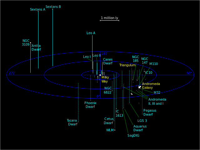 In 2006 it was discovered that nine of these galaxies lie along a plane that intersects the core of the Andromeda Galaxy, rather than being randomly arranged as would be expected from independent interactions. This may indicate a common tidal origin for the satellites.