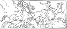 The earliest documented use of the word "Arab" to refer to a people appears in the Monolith Inscription, an Akkadian language record of the 9th century BC Assyrian Conquest of Syria (Arabs had formed part of a coalition of forces opposed to Assyria). Listed among the booty captured by the army of king Shalmaneser III of Assyria in the Battle of Qarqar are 1000 camels of "Gi-in-di-bu'u the ar-ba-a-a" or "[the man] Gindibu belonging to the ʕarab" (ar-ba-a-a being an adjectival nisba of the noun ʕarab).