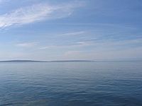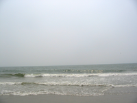 The Atlantic Ocean as seen from the eastern coast of North America near the shared boundary of North and South Carolina on a hazy summer day.